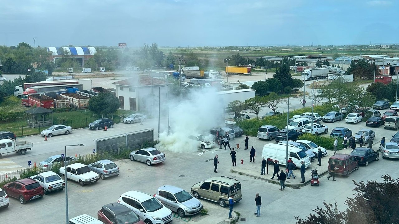 Karacabey Devlet Hastanesi'ne yakınını getiren Turgay Ç., 77 AAK 391 plakalı otomobilini saat 11.00 sıralarında otoparka park etti. Bir süre sonra aracın motor kısmından dumanlar yükselmeye başladı, ardından da alev aldı. Çevredekilerin ihbarı üzerine adrese itfaiye, polis ve sağlık ekipleri sevk edildi. Polis ekipleri yangın tüpüyle ilk müdahaleyi yaparken, kısa sürede gelen itfaiye ekipleri alevleri kontrol altına alarak söndürdü.