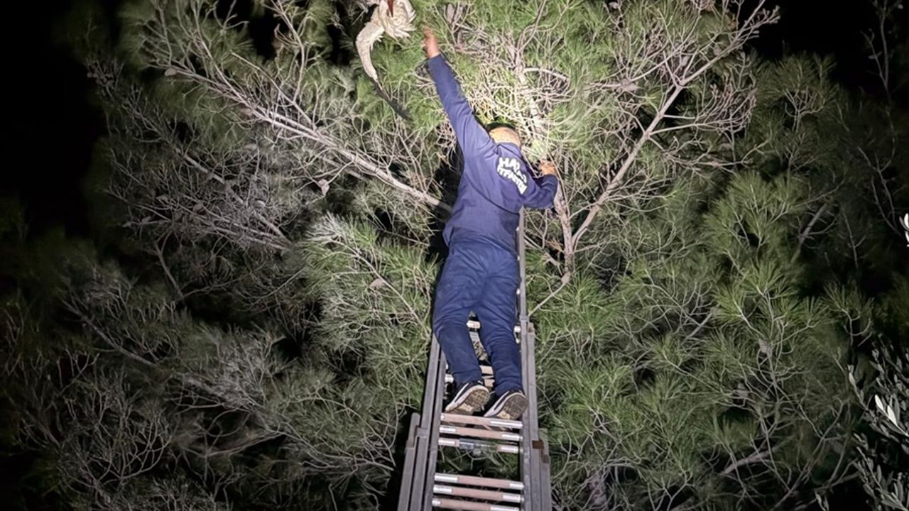 HATAY (AA) - Hatay'ın Belen ilçesinde ağaçta asılı kalan leylek, itfaiye ekiplerince kurtarıldı.