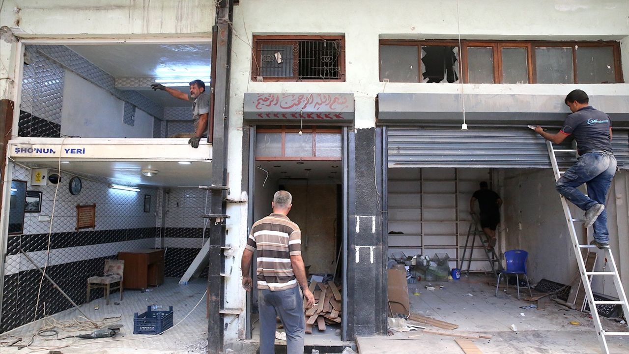 Bazı iş yerlerinin yıkıldığı çarşıda afetin ardından başlatılan restorasyon çalışmaları sürüyor.