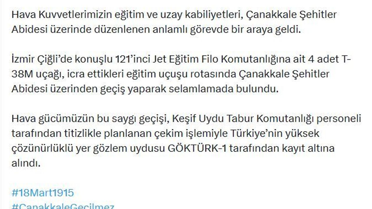 Milli Savunma Bakanlığı'nın (MSB), sanal medya hesabından yapılan paylaşımda, ''Ey şehit oğlu şehit, isteme benden makber, sana aguşunu açmış duruyor Peygamber.' Hava Kuvvetlerimizin eğitim ve uzay kabiliyetleri, Çanakkale Şehitler Abidesi üzerinde düzenlenen anlamlı görevde bir araya geldi. İzmir Çiğli'de konuşlu 121'inci Jet Eğitim Filo Komutanlığına ait 4 adet T-38M uçağı, icra ettikleri eğitim uçuşu rotasında Çanakkale Şehitler Abidesi üzerinden geçiş yaparak selamlamada bulundu. Hava gücümüzün bu saygı geçişi, Keşif Uydu Tabur Komutanlığı personeli tarafından titizlikle planlanan çekim işlemiyle Türkiye'nin yüksek çözünürlüklü yer gözlem uydusu GÖKTÜRK-1 tarafından kayıt altına alındı' denildi. (DHA)