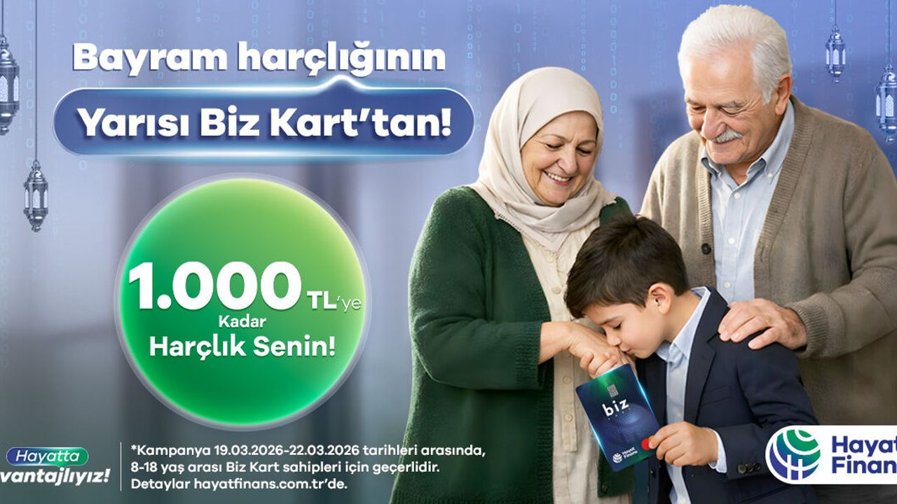 Dijital banka Hayat Finans, bayram harçlığı geleneğini dijital bankacılığın avantajlarıyla buluşturan yeni kampanyasını duyurdu. 'Bayram harçlığının yarısı BİZ'den' kampanyası kapsamında, Biz Kart sahibi 8-18 yaş arası çocuk ve genç kullanıcıların bayram döneminde (19-22 Mart 2026) hesaplarına gelen TL harçlıklarının yarısı kadar, 1.000 TL'ye kadar destek sunuyor.