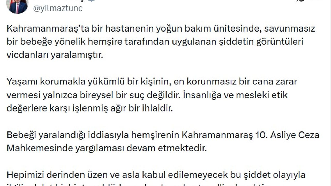 Adalet Bakanı Yılmaz Tunç, olayla ilgili sanal medya hesabından açıklama yaptı. Bakan Tunç, 'Kahramanmaraş'ta bir hastanenin yoğun bakım ünitesinde, savunmasız bir bebeğe yönelik hemşire tarafından uygulanan şiddetin görüntüleri vicdanları yaralamıştır. Yaşamı korumakla yükümlü bir kişinin, en korunmasız bir cana zarar vermesi yalnızca bireysel bir suç değildir. İnsanlığa ve mesleki etik değerlere karşı işlenmiş ağır bir ihlaldir. Bebeği yaralandığı iddiasıyla hemşirenin Kahramanmaraş 10'uncu Asliye Ceza Mahkemesinde yargılaması devam etmektedir. Hepimizi derinden üzen ve asla kabul edilemeyecek bu şiddet olayıyla ilgili adalet hiçbir tereddüde yer bırakmadan tecelli edecektir' dedi. (DHA)