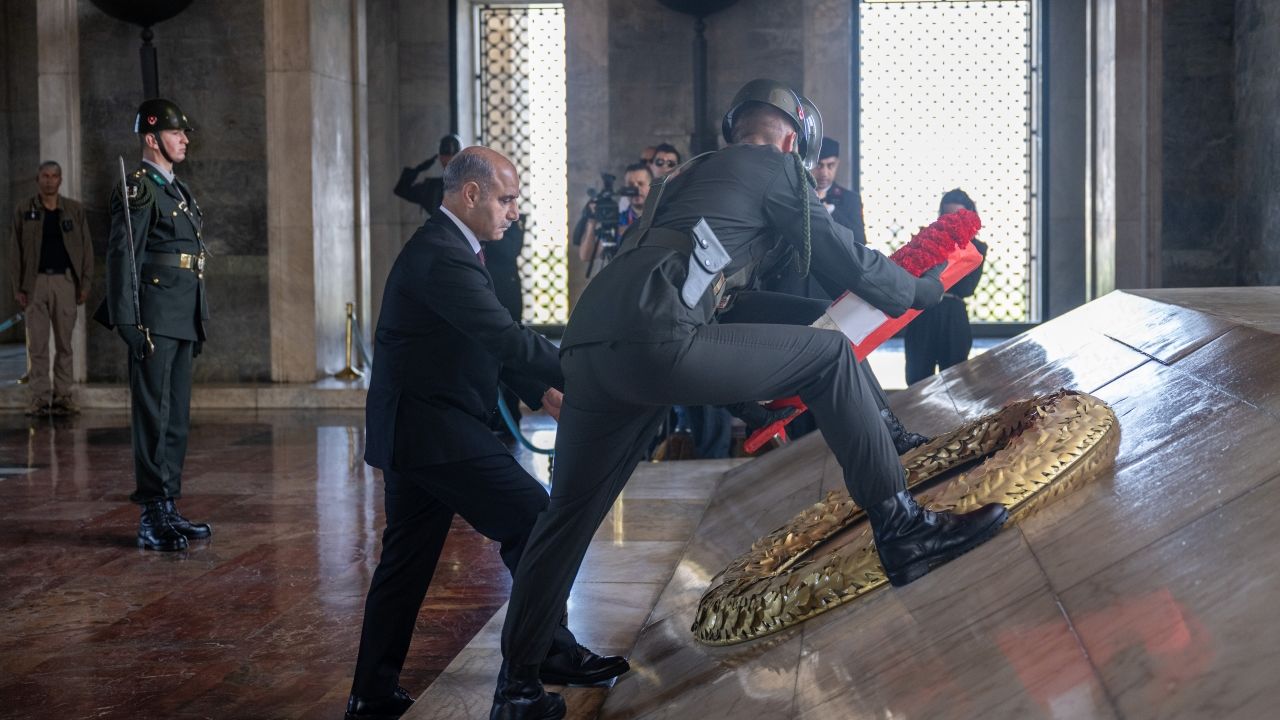 Burada mozoleye çelenk bırakılmasının ardından saygı duruşunda bulunuldu.