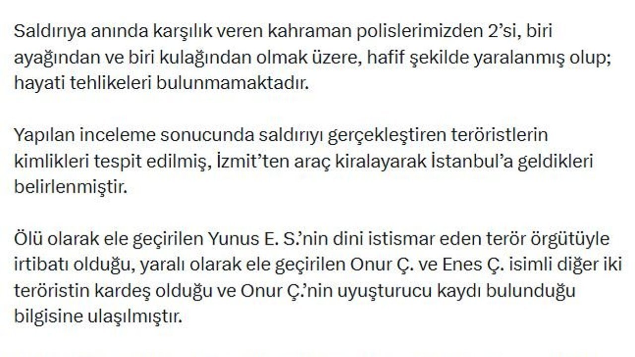 Bakanlığın sanal medya hesabından yapılan açıklamada, 'İstanbul'un Beşiktaş ilçesinde bulunan Yapı Kredi Plaza Blokları önünde görevli çevik kuvvet polislerimize yönelik gerçekleştirilen silahlı saldırı sonucu 3 terörist etkisiz hale getirilmiştir. Saldırıya anında karşılık veren kahraman polislerimizden 2'si, biri ayağından ve biri kulağından olmak üzere, hafif şekilde yaralanmış olup; hayati tehlikeleri bulunmamaktadır. Yapılan inceleme sonucunda saldırıyı gerçekleştiren teröristlerin kimlikleri tespit edilmiş, İzmit'ten araç kiralayarak İstanbul'a geldikleri belirlenmiştir. Ölü olarak ele geçirilen Yunus E.S.'nin dini istismar eden terör örgütüyle irtibatı olduğu, yaralı olarak ele geçirilen Onur Ç. ve Enes Ç. isimli diğer 2 teröristin kardeş olduğu ve Onur Ç.'nin uyuşturucu kaydı bulunduğu bilgisine ulaşılmıştır. Etkisiz hale getirilen 3 terörist arasında yoğun dijital haberleşme tespit edilmiş olup yaralı teröristlerin sorgusu devam etmektedir' ifadelerine yer verildi. (DHA)