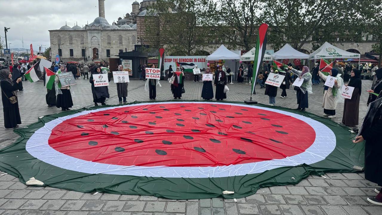 Katılımcıların meydanda oluşturduğu dairenin ortasına Gazze direnişinin simgelerinden biri haline gelen karpuz simgesi yerleştirildi.