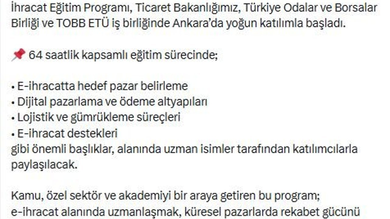 Bakanlığın sanal medya hesabından yapılan açıklamada, 'Ticaret Bakanlığımız öncülüğünde, Yükseköğretim Kurulu iş birliğiyle hayata geçirilen İhracat Akademisi, yeni nesil ihracat vizyonumuza yön vermeye devam ediyor. Bu vizyonun en önemli adımlarından biri olan İhracat Akademisi E-İhracat Eğitim Programı, Ticaret Bakanlığımız, Türkiye Odalar ve Borsalar Birliği ve TOBB ETÜ iş birliğinde Ankara'da yoğun katılımla başladı. 64 saatlik kapsamlı eğitim sürecinde; e-ihracatta hedef pazar belirleme, dijital pazarlama ve ödeme altyapıları, lojistik ve gümrükleme süreçleri, e-ihracat destekleri gibi önemli başlıklar, alanında uzman isimler tarafından katılımcılarla paylaşılacak' denildi. Açıklamada ayrıca 'Kamu, özel sektör ve akademiyi bir araya getiren bu program; e-ihracat alanında uzmanlaşmak, küresel pazarlarda rekabet gücünü artırmak ve markalarını dünyaya taşımak isteyen girişimcilerimiz için güçlü bir gelişim imkanı sunuyor. 'Türkiye Yüzyılı'nda ihracatımızı dijitalleşmeyle güçlendirmeye, girişimcilerimizi küresel pazarlara hazırlamaya devam edeceğiz' ifadelerine yer verildi. (DHA)