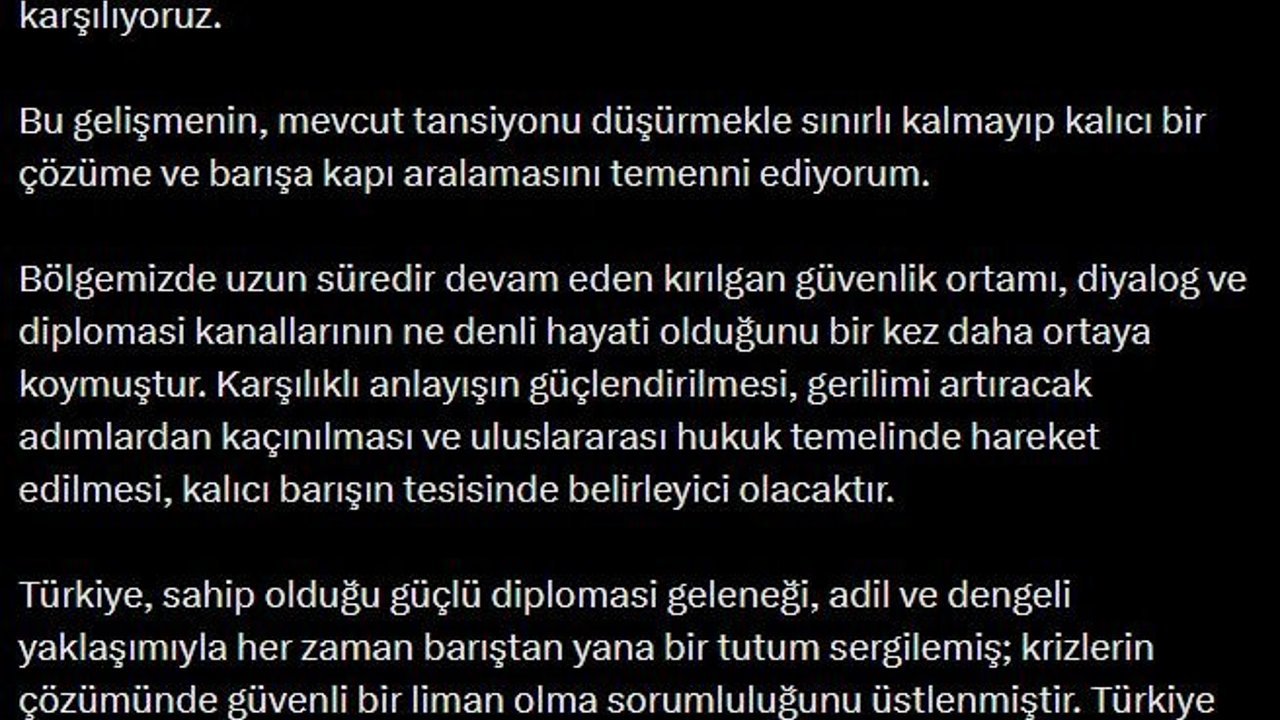 ANKARA, (DHA)- İLETİŞİM Başkanı Burhanettin Duran, 'İran, ABD ve İsrail arasında ilan edilen geçici ateşkesi; bölgesel istikrar ve küresel barış açısından önemli bir fırsat olarak görüyor ve memnuniyetle karşılıyoruz' dedi.