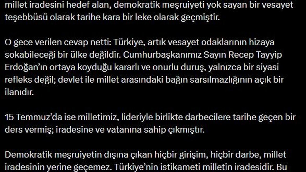 İletişim Başkanı Burhanettin Duran, sanal medya hesabından yaptığı açıklamada, '27 Nisan e-muhtırasının üzerinden 19 yıl geçti. Bu girişim, doğrudan millet iradesini hedef alan, demokratik meşruiyeti yok sayan bir vesayet teşebbüsü olarak tarihe kara bir leke olarak geçmiştir. O gece verilen cevap netti. Türkiye, artık vesayet odaklarının hizaya sokabileceği bir ülke değildir. Cumhurbaşkanımız Sayın Recep Tayyip Erdoğan'ın ortaya koyduğu kararlı ve onurlu duruş, yalnızca bir siyasi refleks değil; devlet ile millet arasındaki bağın sarsılmazlığının açık bir ilanıdır. 15 Temmuz'da ise milletimiz, lideriyle birlikte darbecilere tarihe geçen bir ders vermiş; iradesine ve vatanına sahip çıkmıştır. Demokratik meşruiyetin dışına çıkan hiçbir girişim, hiçbir darbe millet iradesinin yerine geçemez. Türkiye'nin istikameti milletin iradesidir. Bu irade ne tartışmaya açıktır ne de herhangi bir odağın müdahalesine bırakılabilir' dedi. (DHA)