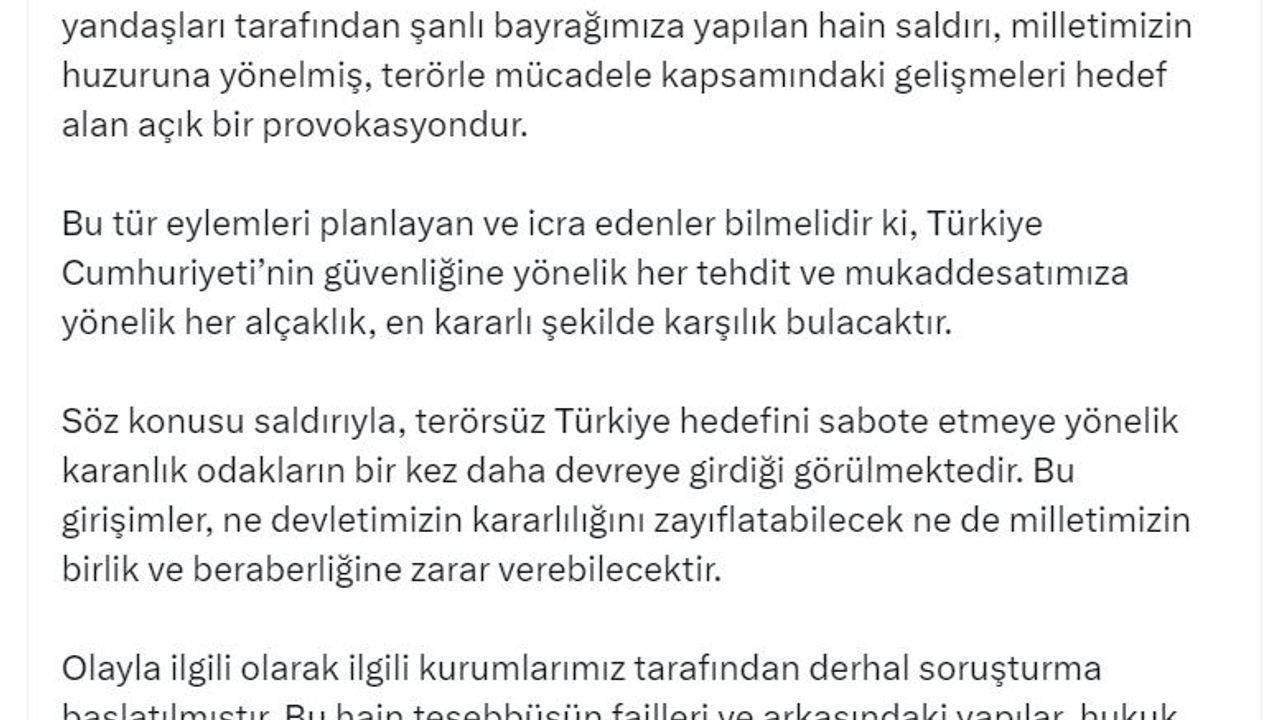 İletişim Başkanı Duran, sanal medya hesabından yaptığı açıklamada, 'Nusaybin-Kamışlı sınır hattında, Suriye tarafındaki terör örgütü YPG yandaşları tarafından şanlı bayrağımıza yapılan hain saldırı, milletimizin huzuruna yönelmiş, terörle mücadele kapsamındaki gelişmeleri hedef alan açık bir provokasyondur. Bu tür eylemleri planlayan ve icra edenler bilmelidir ki Türkiye Cumhuriyeti'nin güvenliğine yönelik her tehdit ve mukaddesatımıza yönelik her alçaklık, en kararlı şekilde karşılık bulacaktır. Söz konusu saldırıyla, terörsüz Türkiye hedefini sabote etmeye yönelik karanlık odakların bir kez daha devreye girdiği görülmektedir. Bu girişimler, ne devletimizin kararlılığını zayıflatabilecek ne de milletimizin birlik ve beraberliğine zarar verebilecektir. Olayla ilgili olarak ilgili kurumlarımız tarafından derhal soruşturma başlatılmıştır. Bu hain teşebbüsün failleri ve arkasındaki yapılar, hukuk devleti ilkeleri çerçevesinde tespit edilerek gerekli tüm adli ve idari işlemler gecikmeksizin uygulanacaktır. Hiçbir saldırı ve provokasyon cezasız kalmayacaktır' ifadelerini kullandı. (DHA)