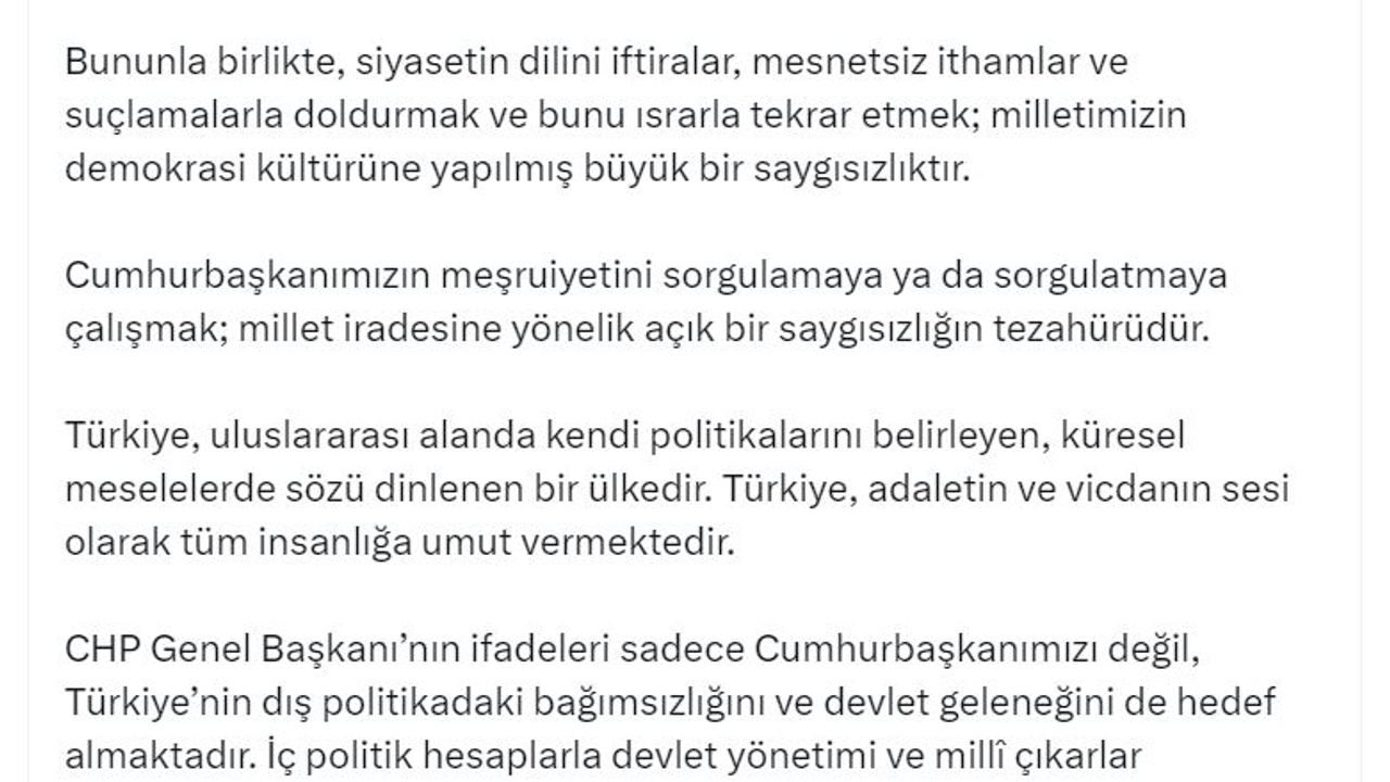 İletişim Başkanı Duran, sanal medya hesabından yaptığı açıklamada, 'CHP Genel Başkanı Özgür Özel'in, Cumhurbaşkanımız Sayın Recep Tayyip Erdoğan'ı hedef alan, hiçbir temele dayanmayan sorumsuz ifadeleri apaçık iftira mahiyeti taşımaktadır. Bununla birlikte, siyasetin dilini iftiralar, mesnetsiz ithamlar ve suçlamalarla doldurmak ve bunu ısrarla tekrar etmek; milletimizin demokrasi kültürüne yapılmış büyük bir saygısızlıktır. Cumhurbaşkanımızın meşruiyetini sorgulamaya ya da sorgulatmaya çalışmak; millet iradesine yönelik açık bir saygısızlığın tezahürüdür. Türkiye, uluslararası alanda kendi politikalarını belirleyen, küresel meselelerde sözü dinlenen bir ülkedir. Türkiye, adaletin ve vicdanın sesi olarak tüm insanlığa umut vermektedir. CHP Genel Başkanının ifadeleri sadece Cumhurbaşkanımızı değil, Türkiye'nin dış politikadaki bağımsızlığını ve devlet geleneğini de hedef almaktadır. İç politik hesaplarla devlet yönetimi ve milli çıkarlar konularında iftira dilini kullanmak liyakat sorunlarına da işaret etmektedir. Sayın Cumhurbaşkanımıza yönelik bu çirkin dili ve yakışıksız ifadeleri kesin bir dille kınıyorum. Özgür Özel, devletin en yüce makamına karşı daha sorumlu, saygılı ve ölçülü bir üslup benimsemelidir' dedi. (DHA)