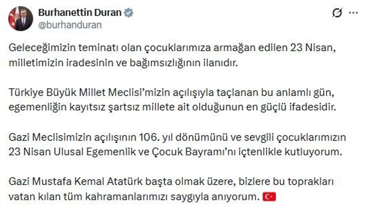 ANKARA, (DHA)- İLETİŞİM Başkanı Burhanettin Duran, 23 Nisan Ulusal Egemenlik ve Çocuk Bayramı ile TBMM'nin açılışının 106'ncı yıl dönümüne ilişkin mesaj paylaştı.