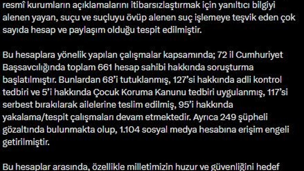 Ayrıca 249 şüphelinin gözaltında bulunduğu kaydedilerek, '1104 sosyal medya hesabına ise erişim engeli getirilmiştir. Bu hesaplar arasında, özellikle milletimizin huzur ve güvenliğini hedef alan, okulları adres gösterip saldırı gerçekleştirileceğinden bahisle tedirginlik oluşturan çok sayıda hesap sahibi tespit edilmiştir. 275 okulu hedef gösteren 389 hesap kullanıcısı tespit edilerek gözaltına alınmış, adli makamlarca işlemleri devam etmektedir. Konu, başta Ankara, Kahramanmaraş ve Şanlıurfa Başsavcılıkları olmak üzere 81 ilde 171 Cumhuriyet başsavcılığı nezdinde hassasiyetle takip edilmektedir. Süreç Adalet Bakanlığımız, İçişleri Bakanlığımız ve Milli Eğitim Bakanlığımız ile koordinasyon halinde yürütülmektedir' ifadelerine yer verildi. (DHA)