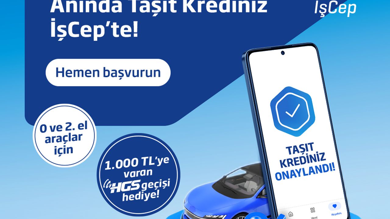İşCep ile banka müşterilerinin şubeye gitmeden diledikleri yerden taşıt kredisi başvurusunda bulunabilmesi araç alım satım sürecini hem bayiler hem de müşteriler için çok daha hızlı ve pratik hale getiriyor. Başvurudan kullandırıma ve ödemeye kadar tüm sürecin dijital olması, müşterilere kolay ve kesintisiz bir deneyim sunarken; sözleşmelerin dijital olarak onaylanmasıyla kağıt tüketimi azaltılarak çevresel sürdürülebilirliğe de katkı sağlanıyor. Ayrıca İş Bankası, şubat sonuna kadar İşCep'ten Anında Taşıt Kredisi'ne başvuru yaparak araç alanlara HGS (hızlı geçiş sistemi) ile kullanılabilecek 1.000 TL değerinde geçiş hakkı hediye ediyor.