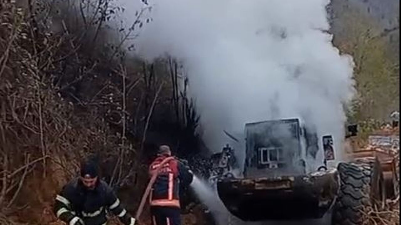 Ziya AKYILDIZ/ BORÇKA(Artvin), (DHA)- ARTVİN'in Borçka ilçesinde yol çalışması sırasında yanan iş makinesi, itfaiye ekiplerince söndürüldü. Yangın anları cep telefonu kamerasıyla görüntülendi.