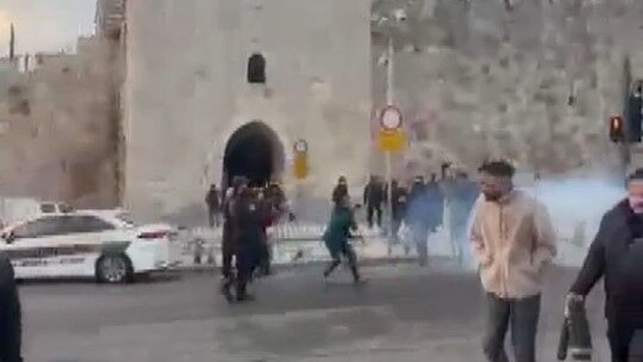 FİLİSTİN, (DHA) - İSRAİL güçleri, Doğu Kudüs'teki Eski Şehir'in kapılarından Bab el-Sahira'da bayram namazı kılmak için toplanan Filistinlilere göz yaşartıcı gazla müdahale etti.