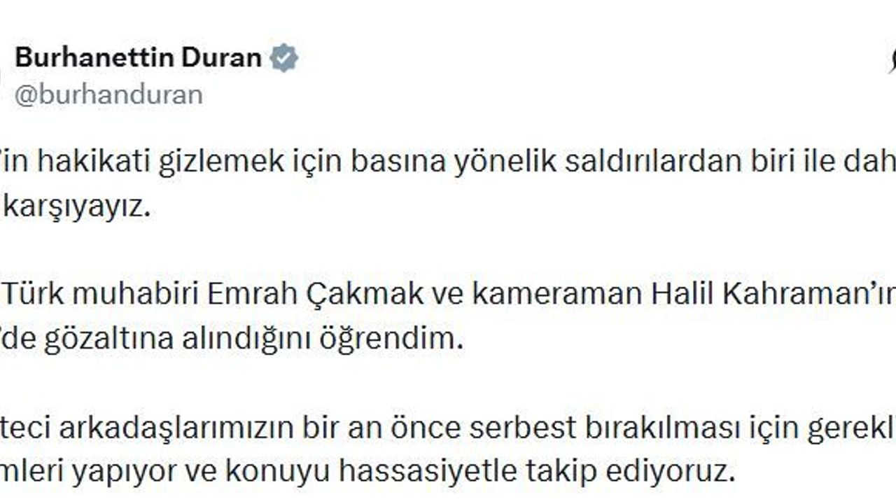 İletişim Başkanı Burhanettin Duran, sanal medya hesabından yaptığı açıklamada, 'İsrail'in hakikati gizlemek için basına yönelik saldırılardan biri ile daha karşı karşıyayız. CNN Türk muhabiri Emrah Çakmak ve kameraman Halil Kahraman'ın İsrail'de gözaltına alındığını öğrendim. Gazeteci arkadaşlarımızın bir an önce serbest bırakılması için gerekli girişimleri yapıyor ve konuyu hassasiyetle takip ediyoruz' dedi. (DHA)