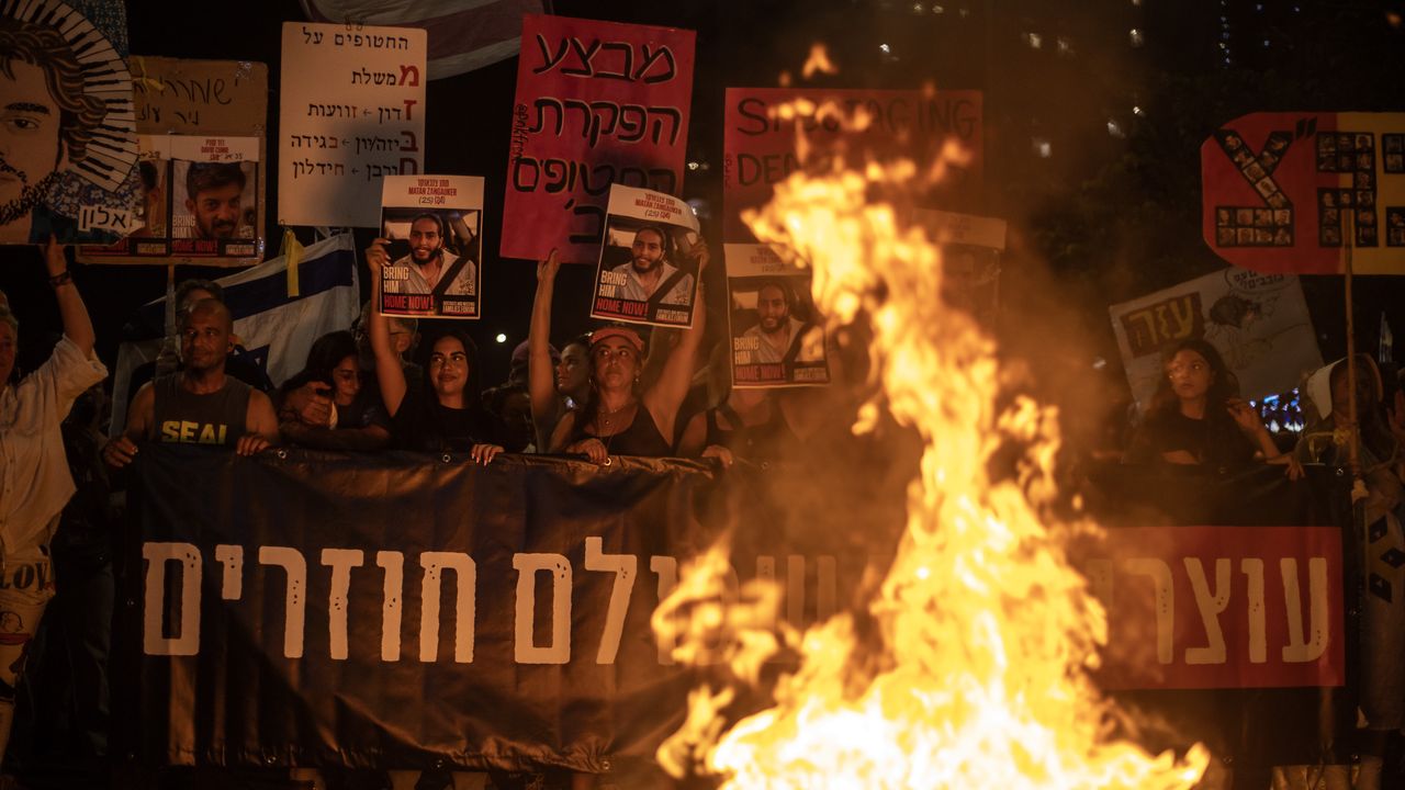 İsrail bayraklarının yanı sıra 'Sen baştasın, sen suçlusun', 'Bu savaşı bitir', 'Esirleri geri getirin' yazılı pankartlar taşıyan göstericiler, attıkları sloganlarda Netanyahu hükümetini anlaşmayı engellemekle suçladı.