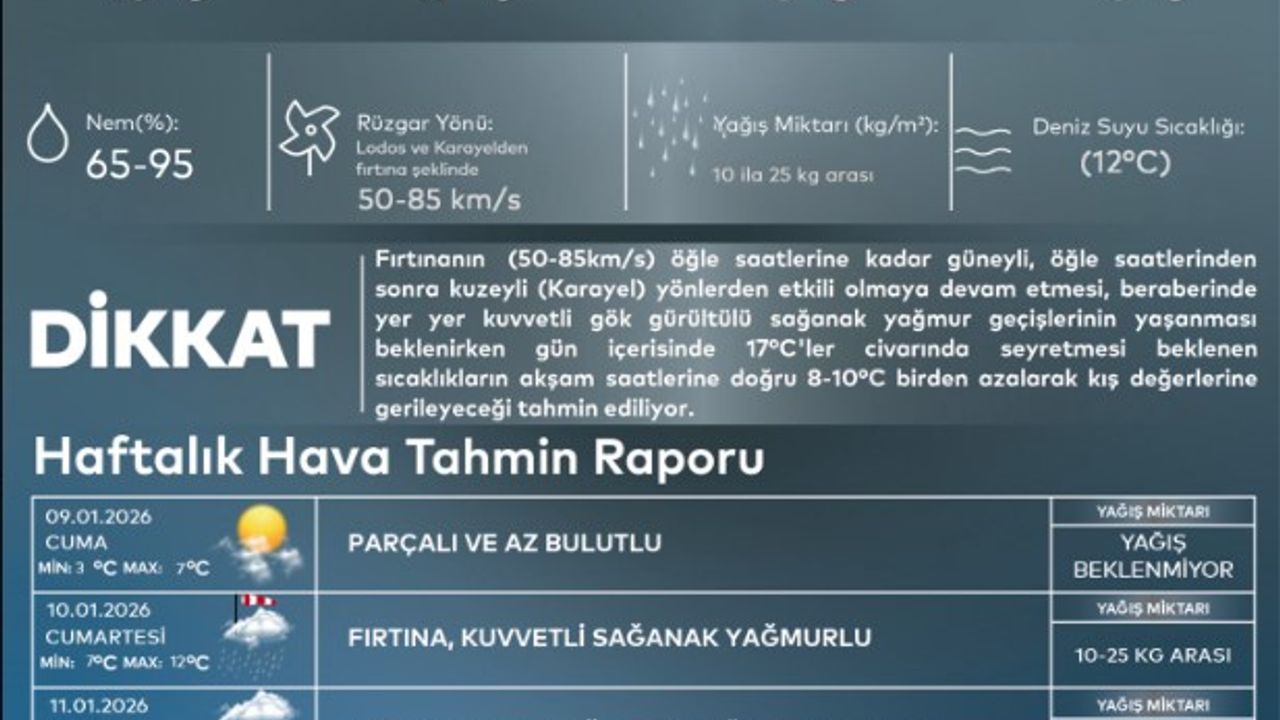 İstanbul'da etkili olan lodosun ardından kentin genelinde yer yer fırtına etkili oluyor. İstanbul Büyükşehir Belediyesi Afet Koordinasyon Merkezi (AKOM) Perşembe günü akşam saatlerinden itibaren sıcaklıkların düşeceğini belirtti. Kent genelinde günboyu fırtına etkili olacak. Sıcaklıkların günboyu 17-18 derece civarında seyretmesi beklenirken, akşam saatlerinden itibaren sıcaklıkların 8-10 derece düşeceği tahmin ediliyor. Cuma günü ise parçalı ve az bulutlu hava etkili olacak. Cumartesi gününden itibaren İstanbul'da fırtına yeniden etkisini artırırken, sağanak yağış da görülecek.