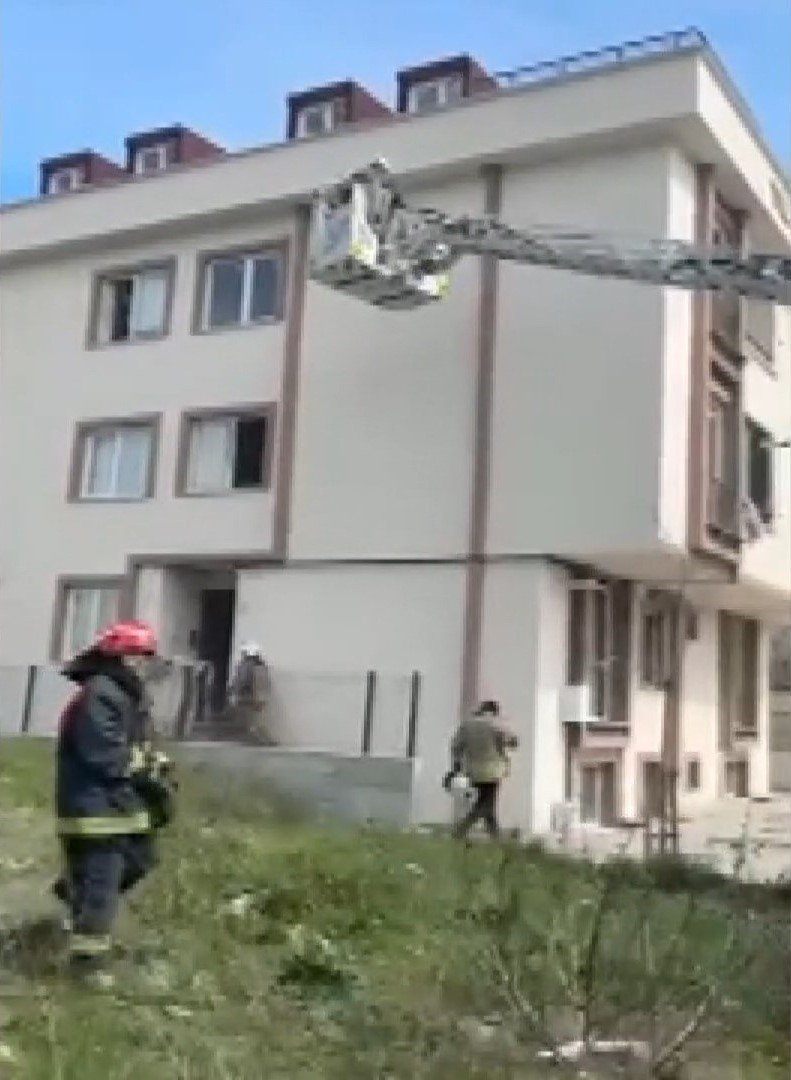 Yangın, Hadımköy Mahallesi Tuğcu Sokak'ta bulunan 3 katlı binada henüz bilinmeyen nedenle çıktı. Kısa sürede büyüyen alevler binayı sararken, yoğun duman nedeniyle binadakiler mahsur kaldı. İhbar üzerine olay yerine çok sayıda itfaiye, sağlık ve polis ekibi sevk edildi. Mahsur kalan 8 kişiden 1'inci kattaki 4 kişi, olay yerine getirilen kepçe yardımıyla tahliye edildi. Üst katlarda bulunan 4 kişi ise itfaiyenin merdiven aracıyla kurtarıldı. Sağlık ekiplerinin olay yerindeki ilk müdahalesinin ardından dumandan etkilenen 4 kişi hastaneye götürüldü. Yangının çıktığı dairenin boş olduğu öğrenilirken, kepçe yardımıyla yapılan tahliye anları cep telefonu kamerasıyla kaydedildi. (DHA)