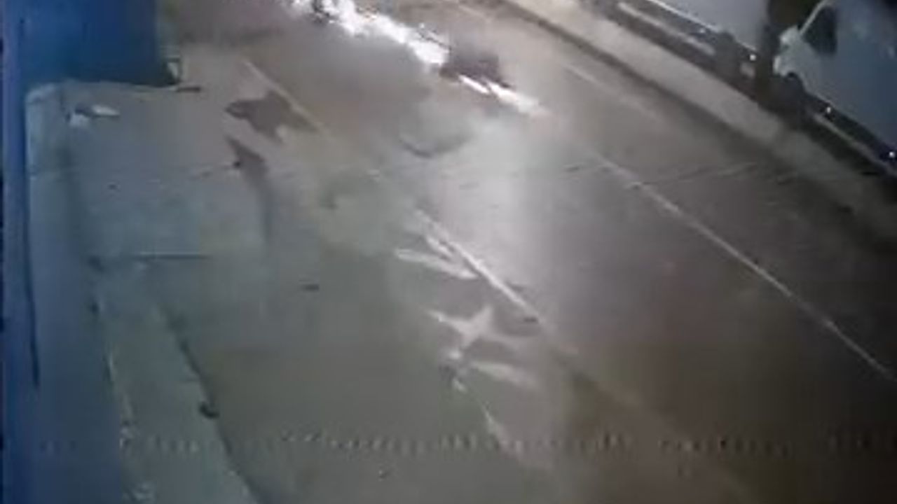 Kaza anı çevredeki bir iş yerinin güvenlik kamerası tarafından görüntülendi. Görüntülerde hafif ticari araç sürücüsü sola dönüş yaptığı sırada karşıdan gelen motosikletle çarpışması ve sürücünün yola savrulduğu görülüyor.