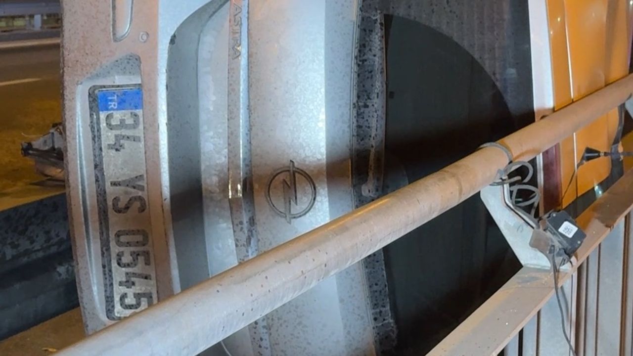 Hafif ticari aracın sürücüsü Refik Erol, 'Otomobil süratli bir şekilde gelirken yandan bir taksi sıkıştırdı. Çarpmamak için direksiyonu kırarken bize sağ köşeden çarptı, bariyerlere düştü. Bizim arabada yaralı yok, içinde 5 kişi vardı' dedi. (DHA)