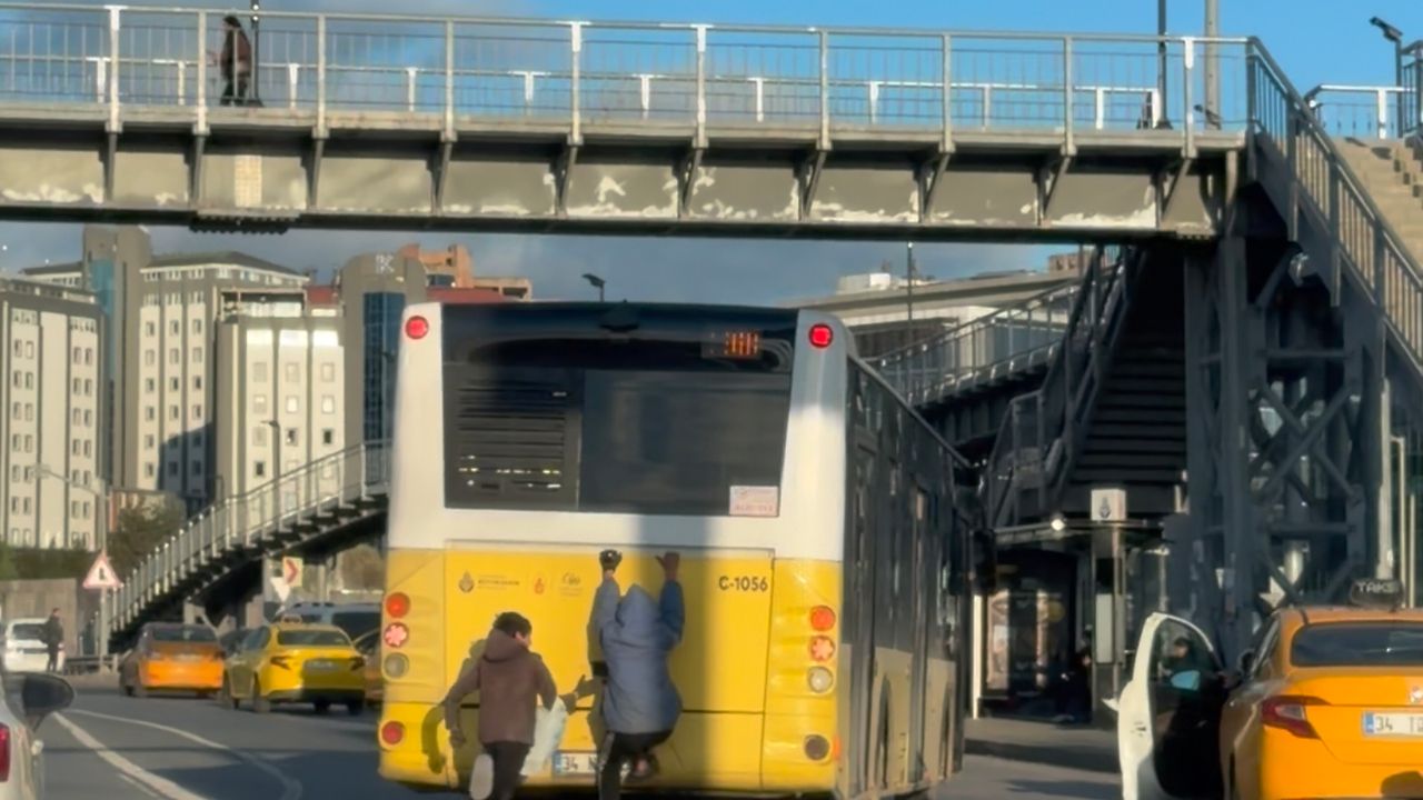 Görüntülerde, çocukların trafikte İETT otobüsünün arkasına asılarak ilerlediği, herhangi bir güvenlik önlemi olmadan yolculuk yaptığı anlar yer alıyor.