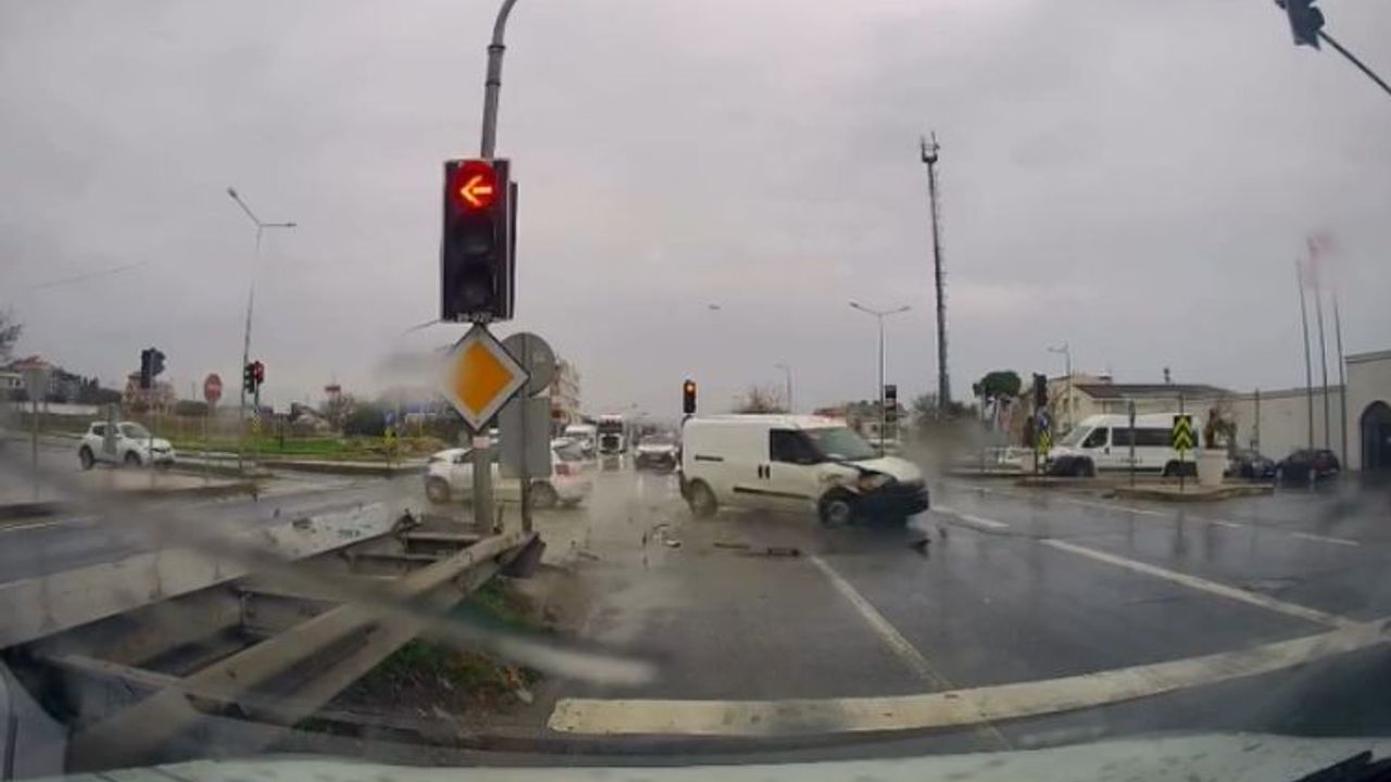 Baran AKKAYA-Hiba HAKBİLİR/İSTANBUL,(DHA)-BÜYÜKÇEKMECE'de sürücüsünün kırmızı ışıkta durmadığı hafif ticari araç, karşı yönde yeşil ışıkta ilerleyen otomobile çarptı. Kaza anı başka bir sürücünün araç içi kamerasıyla kaydedildi.