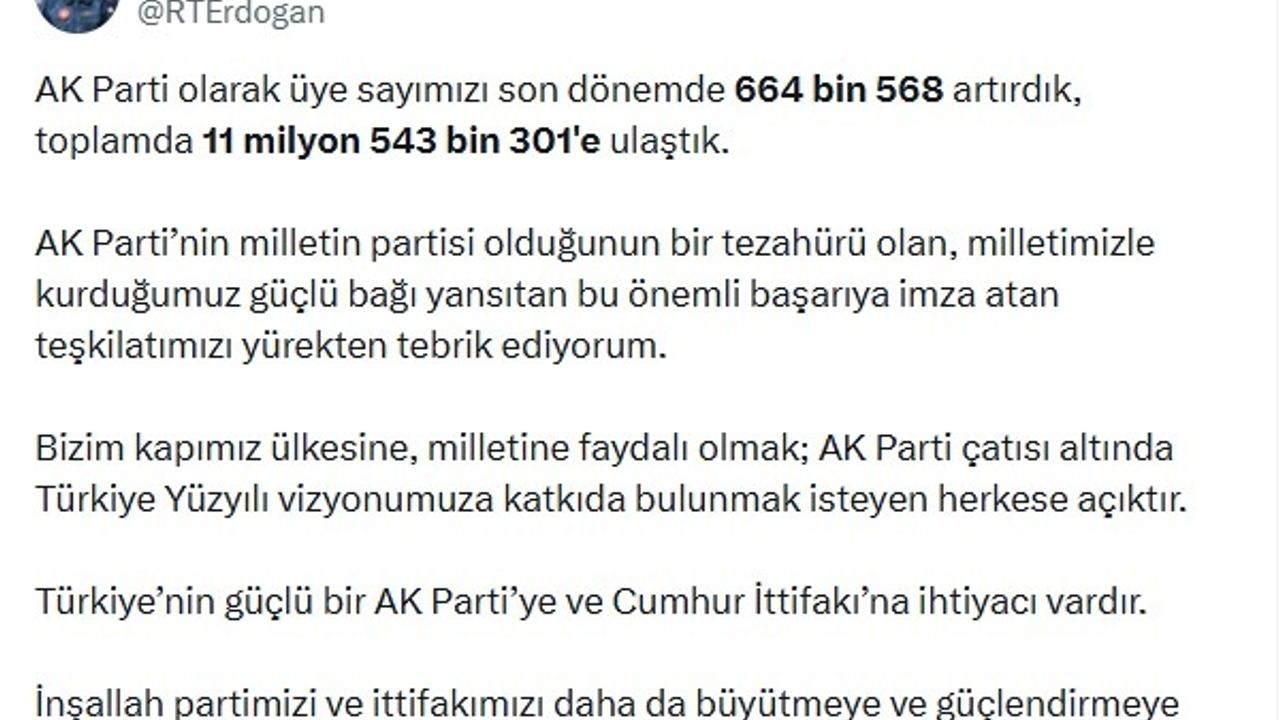 Cumhurbaşkanı Erdoğan, sanal medya hesabından yaptığı paylaşımda, 'AK Parti olarak üye sayımızı son dönemde 664 bin 568 artırdık, toplamda 11 milyon 543 bin 301'e ulaştık. AK Parti'nin milletin partisi olduğunun bir tezahürü olan, milletimizle kurduğumuz güçlü bağı yansıtan bu önemli başarıya imza atan teşkilatımızı yürekten tebrik ediyorum. Bizim kapımız ülkesine, milletine faydalı olmak; AK Parti çatısı altında Türkiye Yüzyılı vizyonumuza katkıda bulunmak isteyen herkese açıktır. Türkiye'nin güçlü bir AK Parti'ye ve Cumhur İttifakı'na ihtiyacı vardır. İnşallah partimizi ve ittifakımızı daha da büyütmeye ve güçlendirmeye devam edeceğiz. #BizBüyükBirAileyiz' ifadelerine yer verdi. (DHA)