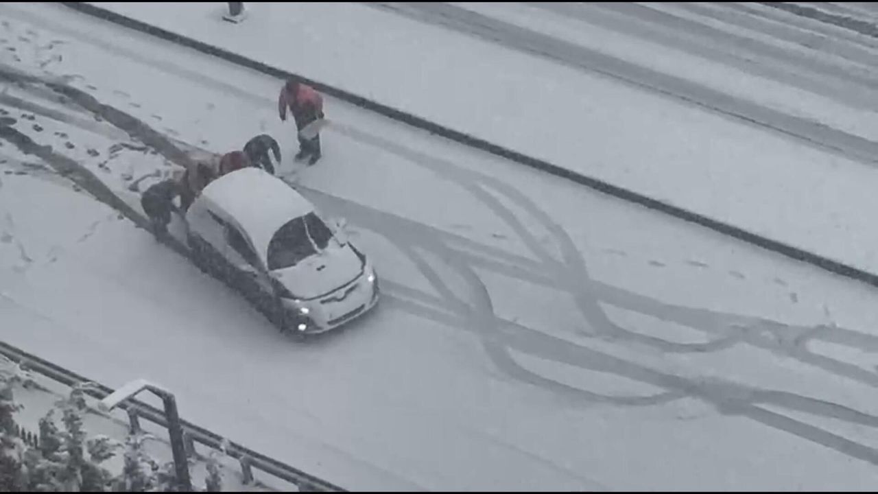 İstanbul'da kar yağışı öğle saatlerinde belli noktalarda etkisini artırdı. TEM Otoyolu Hasdal mevkii yan yolda otomobiller yoğun kar yağışı sonrası ilerlemekte zorlandı. Bazı araçlar yolda kalırken, kar lastiği olmayan araçlardan bazıları ise kaydı. Bazı sürücüler ve çevredekiler yolda kalan araçları iterek ilerlemelerine yardım etti. O anlar cep telefonu kamerasına yansıdı. (DHA)