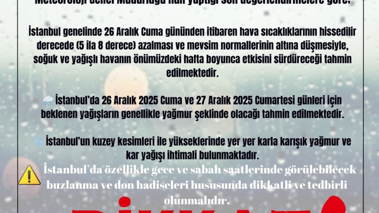 İstanbul Valiliği, Meteoroloji Genel Müdürlüğü'nden alınan raporun ardından kentin yüksek kesimleri için kar yağışı uyarısında bulundu. Valiliğin sanal medya hesabından yapılan açıklamada, 'Meteoroloji Genel Müdürlüğü'nün yaptığı son değerlendirmelere göre; İstanbul genelinde 26 Aralık Cuma gününden itibaren hava sıcaklıklarının hissedilir derecede (5 ila 8 derece) azalması ve mevsim normallerinin altına düşmesiyle, soğuk ve yağışlı havanın önümüzdeki hafta boyunca etkisini sürdüreceği tahmin edilmektedir. İstanbul'da 26 Aralık 2025 Cuma ve 27 Aralık 2025 Cumartesi günleri için beklenen yağışların genellikle yağmur şeklinde olacağı tahmin edilmektedir. İstanbul'un kuzey kesimleri ile yükseklerinde yer yer karla karışık yağmur ve kar yağışı ihtimali bulunmaktadır. İstanbul'da özellikle gece ve sabah saatlerinde görülebilecek buzlanma ve don hadiseleri hususunda dikkatli ve tedbirli olunmalıdır' ifadeleri kullanıldı. (DHA)