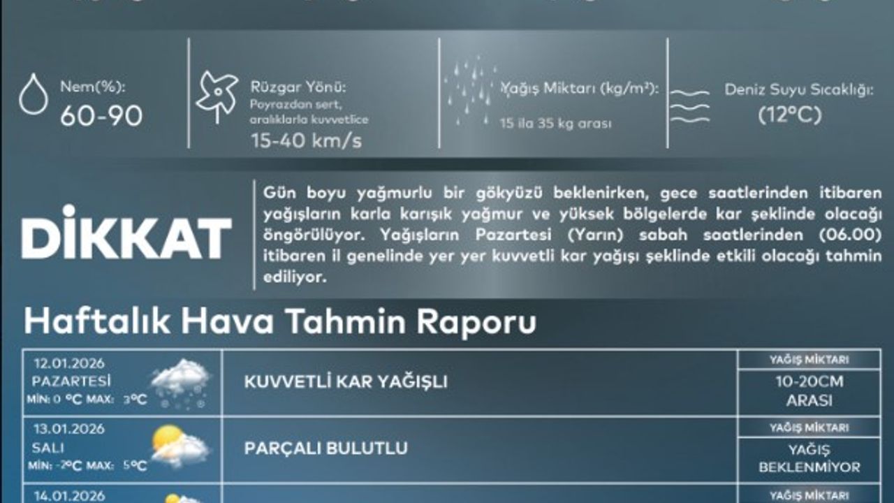 Meteoroloji İşleri Genel Müdürlüğü ve AKOM İstanbul için kuvvetli kar uyarısı yaptı. AKOM'un tahminlerine göre kent genelinde gündüz 10 derecelerde seyreden sıcaklıklar Pazar gece saatlerinde 2-3 derecelere kadar gerileyecek. Gece İstanbul'da karla karışık yağmur, yüksek kesimlerde ise kar görülmesi bekleniyor. Yağışların haftanın ilk iş günü olan Pazartesi günü saat 06.00'dan itibaren İstanbul genelinde yer yer kuvvetli kar şeklinde olacağı tahmin ediliyor. AKOM kent genelinde buzlanma uyarısı da yaptı. Haftanın diğer günleri ise İstanbul'da parçalı ve çocuk bulutlu havanın hakim olması bekleniyor.