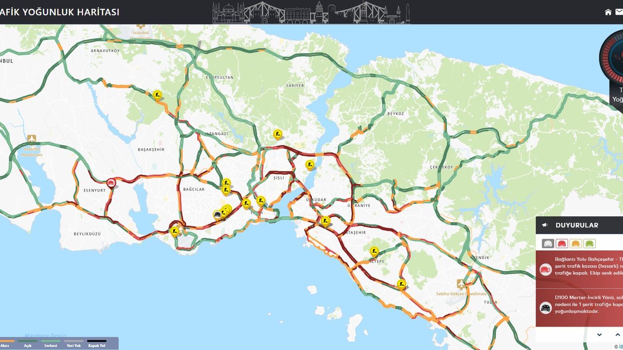 İstanbul'da akşam saatlerinde trafik yoğunluğu oluştu. İstanbul Büyükşehir Belediyesi Trafik Yoğunluğu Haritası verilerine göre saat 19.05 itibariyle yoğunluk yüzde 90'a ulaştı. Kentteki ana arterlerde trafik durma noktasına geldi. D-100 Karayolu Yenisahra Mevkii'nde araçların güçlükle ilerlediği görüldü. Yaşanan trafik yoğunluğu dronla havadan görüntülendi. (DHA)