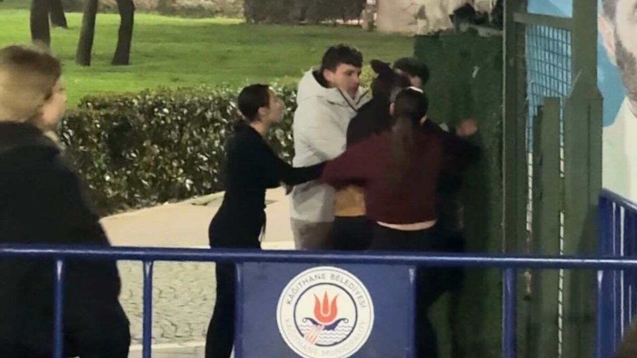Doğan Can CESUR / İSTANBUL (DHA)- KAĞITHANE Hasbahçe'de kız ve erkek öğrenci grubu arasında çıkan tartışma kavgaya dönüştü. Kavga anları cep telefonu kamerasına yansırken, erkek öğrencinin 'Seni mermi manyağı yapacağım', bir kız öğrencinin ise 'Senin burnuna kırarım demedim mi ben sana' dediği duyuldu. Özel güvenlik görevlisi öğrencileri arasındaki kavgayı uzun süre ayırmaya çalıştı.