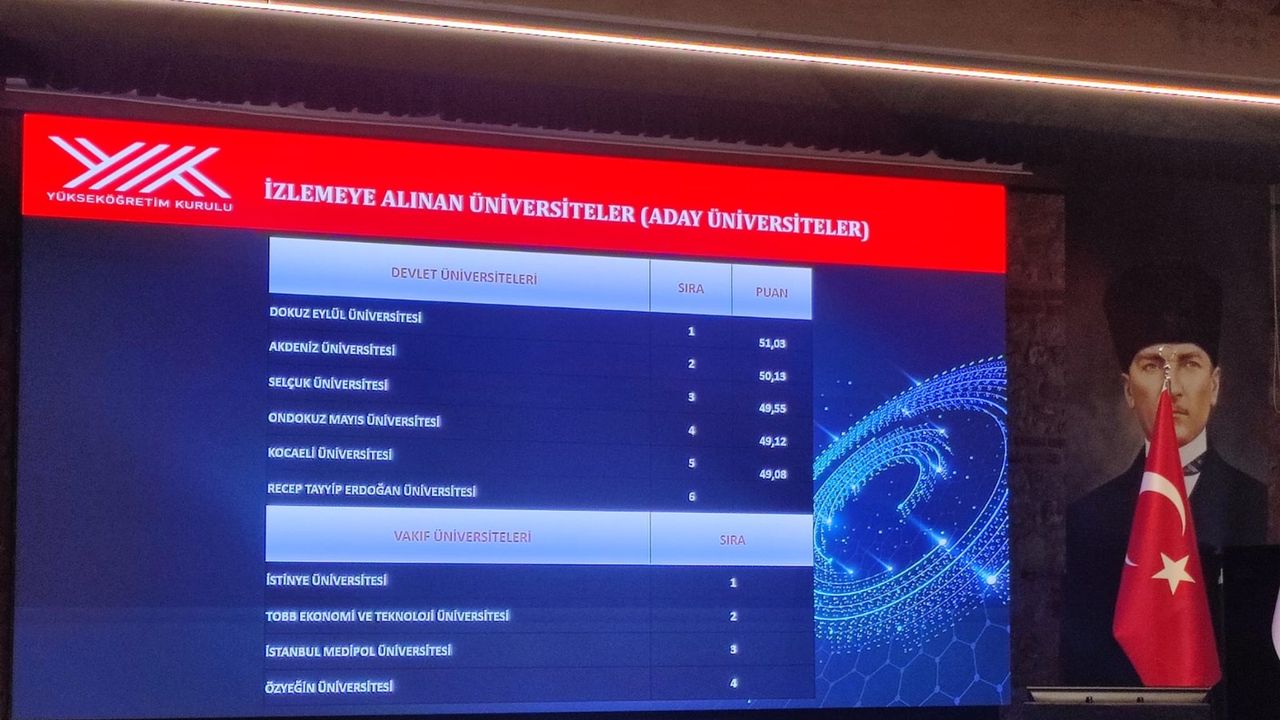 Erol Özvar, 'Yapılan değerlendirmeler sonucunda 6 üniversite Araştırma Üniversiteleri Aday İzleme Programı'na dahil etmiştik. Bu üniversitelerimiz Akdeniz Üniversitesi, Gaziantep Üniversitesi, Kocaeli Üniversitesi, 19 Mayıs Üniversitesi, Sakarya Üniversitesi, Selçuk Üniversiteleridir. Aday izleme programına dahil edilen bu 6 üniversite, 2024 yılı itibarıyla iki yıllık dikkatli bir izleme sürecine alınmıştır. 2025 yılı Araştırma Üniversiteleri Performans sıralamasında Koç Üniversitesi 1'inci sırada yer aldı. 2'nci sırada Sabancı Üniversitesi, 3'üncü sırada Orta Doğu Teknik Üniversitesi yer aldı. Arkasından İstanbul Teknik Üniversitesi geliyor, kutluyoruz. 5'inci sırada Boğaziçi Üniversitemiz var, Boğaziçi Üniversitemizi kutluyoruz. Bu sene ilk beşte, ilk iki sırayı vakıf üniversitesi, sonra devlet üniversitelerimiz, Orta Doğu Teknik Üniversitesi, İstanbul Teknik Üniversitesi ve Boğaziçi Üniversitesi yer alıyor. Sonra Yıldız Teknik Üniversitesi geliyor. Sakarya Üniversitesi, Araştırma Üniversitesi liginde ortaya koyduğu gayret, çaba ve ürünlerle girmeyi başardı ve 15'inci sıradan giriş yapmış oldu. Üniversitemizi tebrik ediyoruz' dedi.