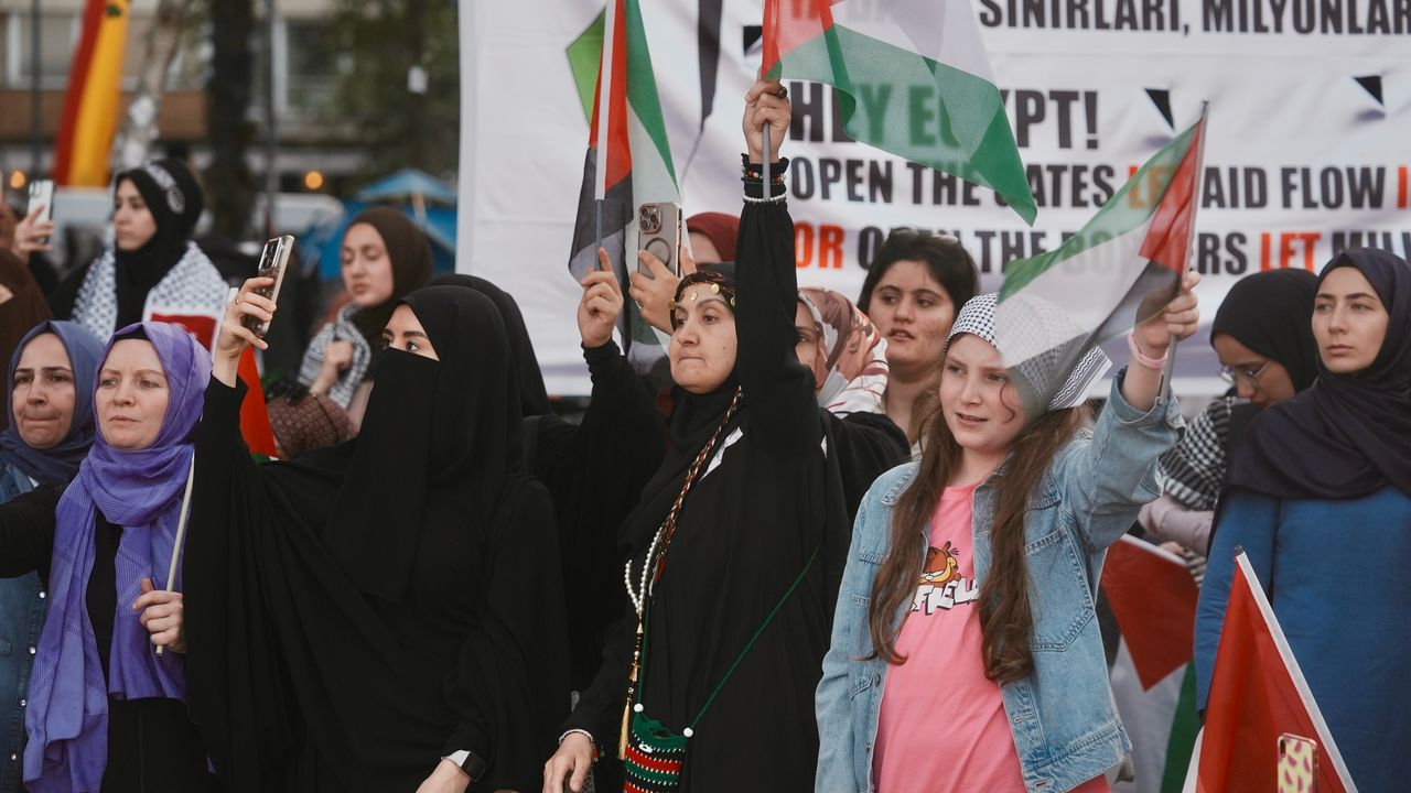 Konsolosluk önünde akşam saatlerinde toplanan katılımcılar, "Özgürlüğün çok yakındır Gazze" sloganları atarak, Gazze'ye yönelik ablukanın sonlandırılmasını istedi.