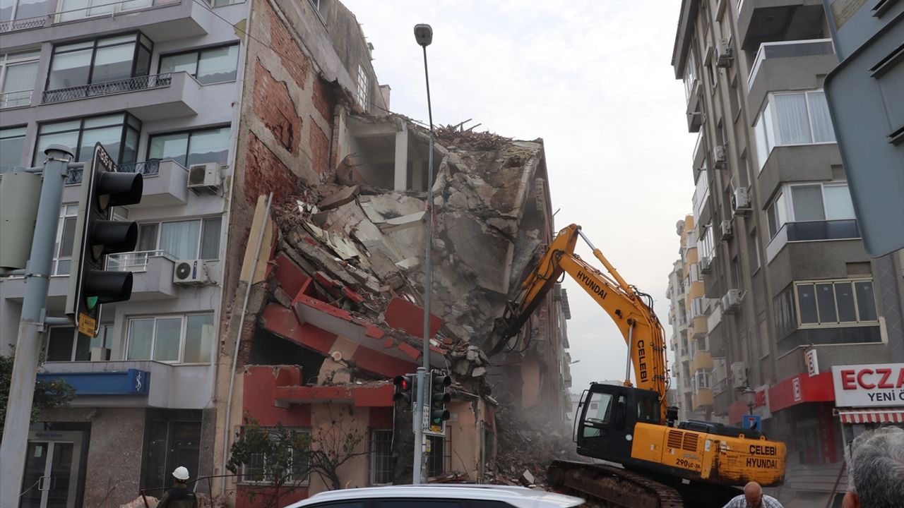 İZMİR (AA) - İzmir'in Balçova ilçesinde bir binanın kontrollü yıkımı sırasında yanındaki apartmanın duvarında hasar meydana geldi.