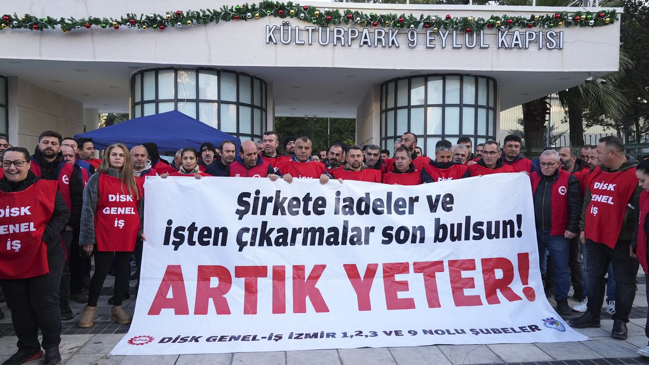 Pazartesi günü başlatılan eylemin beşinci gününde yarım gün iş bırakan bir grup Genel-İş Sendikası üyesi işçi ve sendika temsilcileri, Kültürpark 9 Eylül Kapısı önünde bir araya geldi.