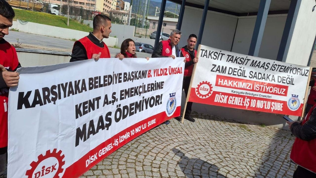 Karşıyaka Belediyesi iştiraki Kent A.Ş.'de çalışan işçiler, 8 aydır maaşlarını ve toplu sözleşmeden doğan farklarını alamadıkları gerekçesiyle eylemlerini sürdürüyor. DİSK Genel-İş 10 No'lu Şube yöneticileri ve işçiler, ana şantiyede düzenlenmesi planlanan bayramlaşma programı öncesinde bir araya gelerek, Karşıyaka Belediye Başkanı Yıldız İşçimenler Ünsal'a tepki gösterdi. Ünsal'ın programı iptal edip, alandan ayrıldığı öğrenildi.