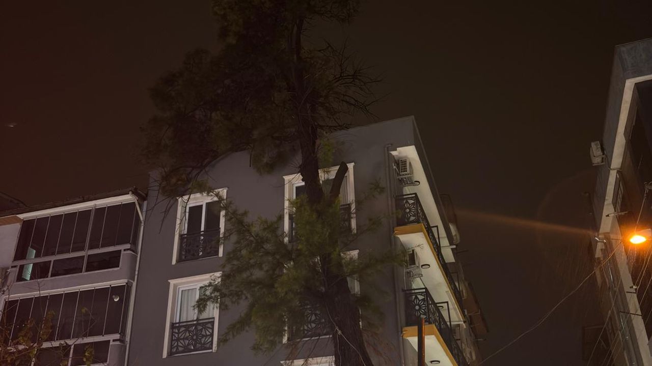 İzmir'in Buca ilçesinde Akdoğan Caddesi'nde bulunan bir ağaç, şiddetli fırtına ve yağış sebebiyle yanındaki binaya dayandı. Çevredekilerin ihbarı üzerine olay yerine itfaiye ve belediye ekipleri sevk edilirken, güvenlik amaçlı ağacın çevresi kapatıldı. Bölgede belediye ekiplerince çalışma başlatıldı. (DHA)