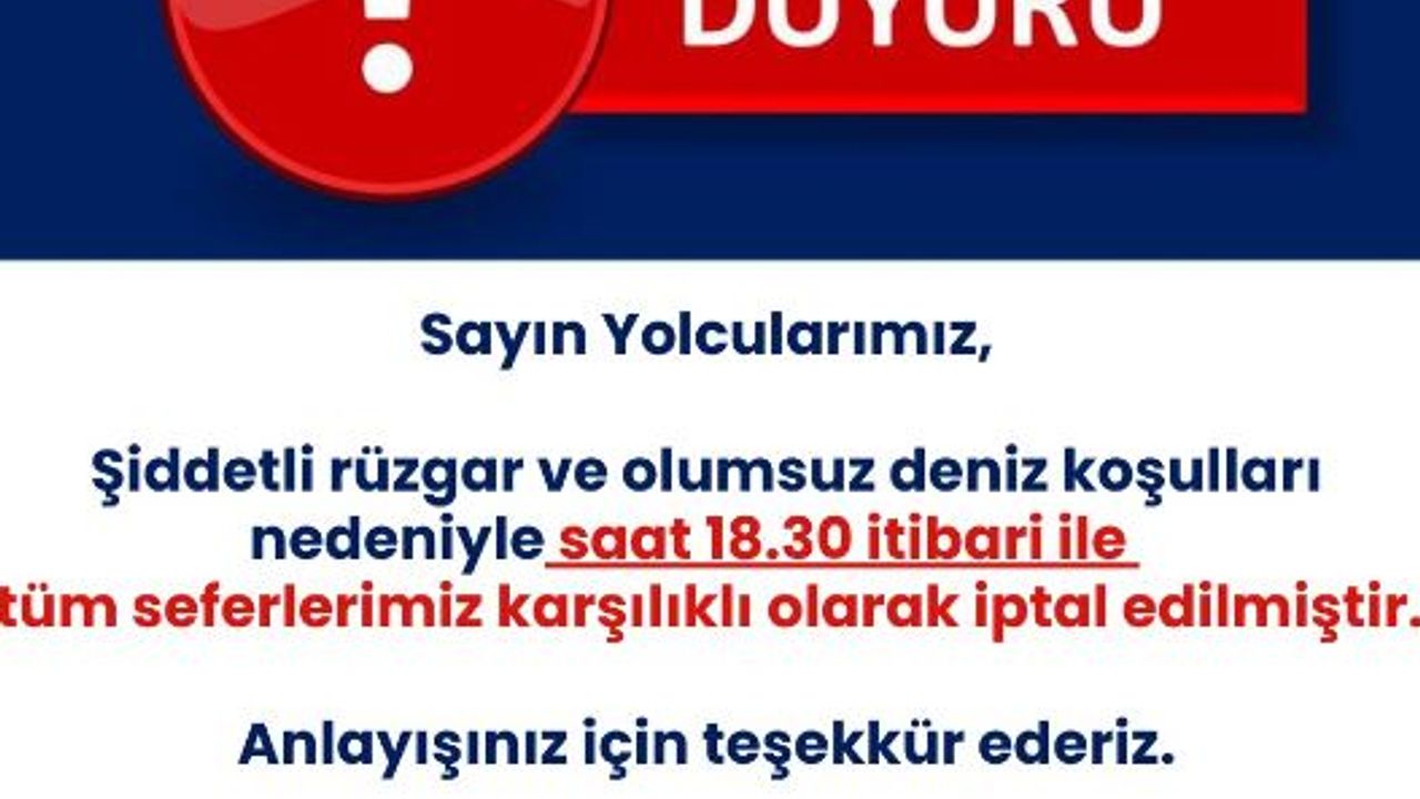 Kadir ÖZEN/ İZMİR, (DHA)- İZMİR Büyükşehir Belediyesi'ne bağlı İZDENİZ, şiddetli rüzgar ve olumsuz deniz koşulları nedeniyle tüm seferlerin iptal edildiğini duyurdu.