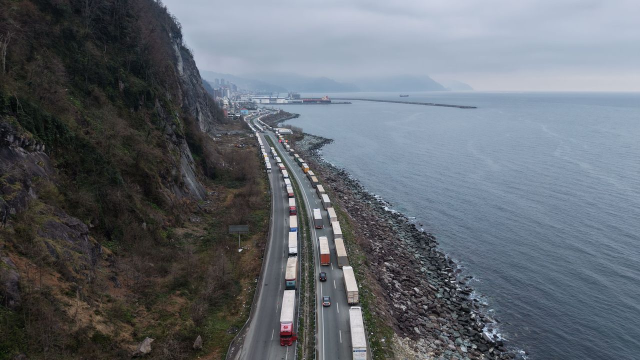 Erhan SARI/ARTVİN, (DHA)- TÜRKİYE'nin Gürcistan üzerinden Kafkaslara açılan Artvin'deki Sarp Sınır Kapısı'nda, Ramazan Bayramı'nda yoğunluk yaşandı. Uluslararası taşımacılık yapılan TIR'lar, Türkiye tarafında Karadeniz Sahil Yolu boyunca uzun kuyruk oluşturdu.