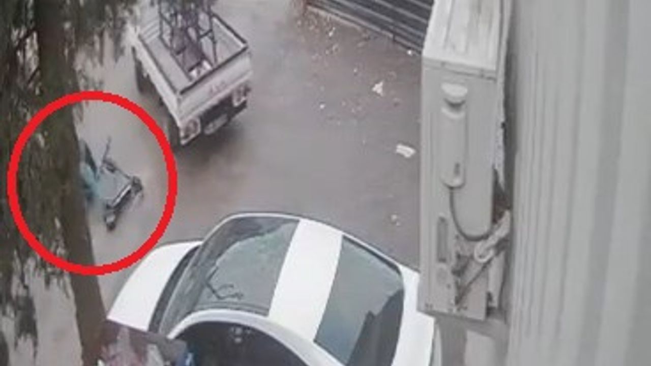 Kamyonet sürücüsü Ercan Ç. gözaltına alınırken, kaza bir iş yerinin güvenlik kamerasına yansıdı. Görüntülerde, park halinde bulunan kamyonetin kontrolsüz şekilde caddeye çıktığı, skuter sürücüsü Serdar Zencirkıran'ın çarpmamak için manevra yaparken, kontrolünü kaybedip düştüğü ve aracın altına savrulduğu görüldü. (DHA)