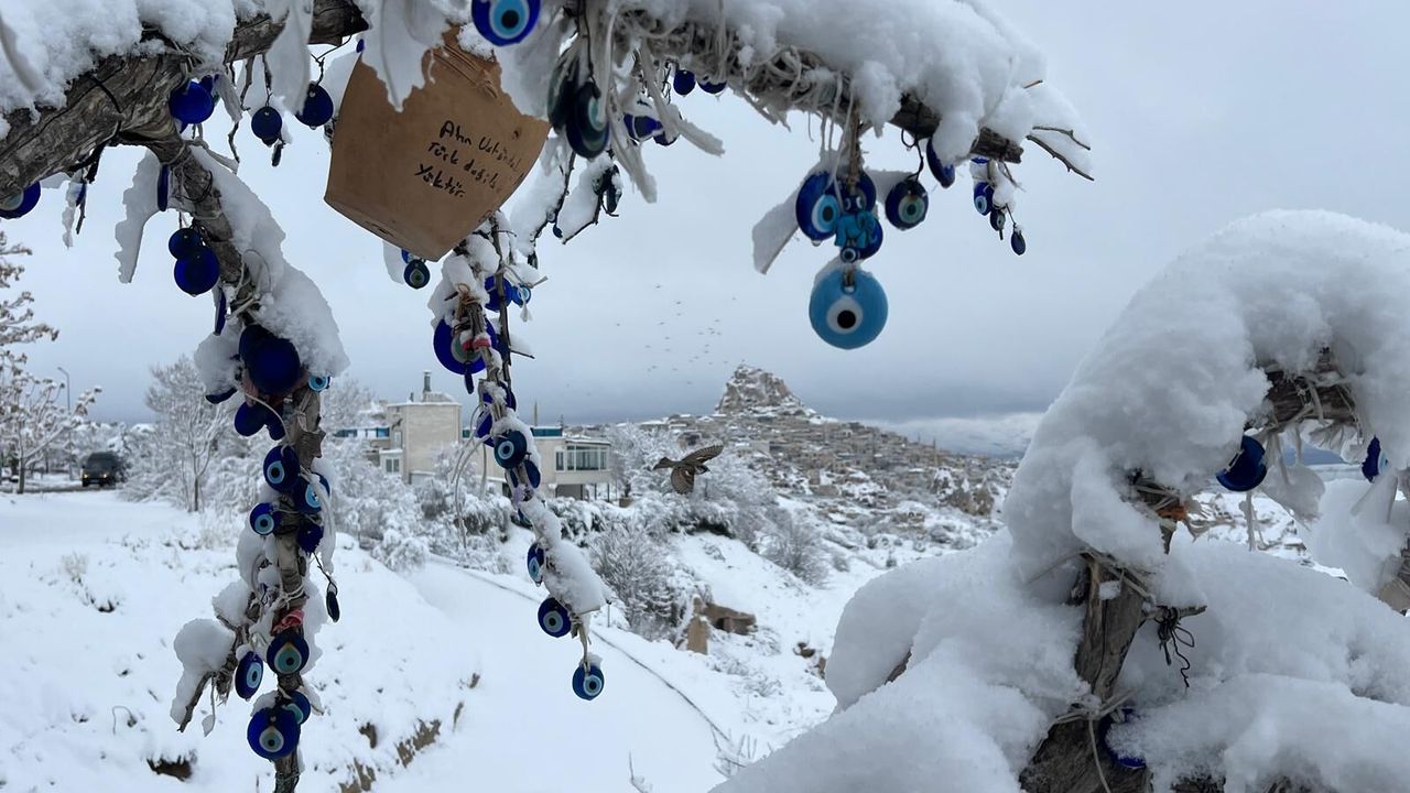 Hava sıcaklıklarının mevsim normallerinin altına düştüğü Kapadokya'da sağanak, yerini kar yağışına bıraktı. Bölgedeki peribacaları, beyaza büründü. Göreme başta olmak üzere Ürgüp, Zelve ve Uçhisar gibi bölgeleri ziyaret eden turistler, kar yağışı sonrası Kapadokya'nın tadını çıkardı. Turist grupları, kar yağışının ardından beyaza bürünen Kapadokya'daki vadilerde fotoğraf çektiriyor. (DHA)