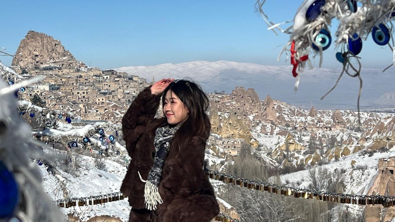 İstanbul'dan gelen Emine Karacaoğlu, 'Buraya yılbaşı için eşimle birlikte geldik. Çok beğendim ama çok soğuk, zor şartlara rağmen geziyoruz. Peribacalarını gördük. Göreme ve Uçhisar'ı gezdik, kaleye çıktık. Herkese tavsiye ediyorum. Peribacaları karla daha güzel, kar her tarafı kaplıyor bembeyaz bu şekilde daha güzel' dedi. (DHA)