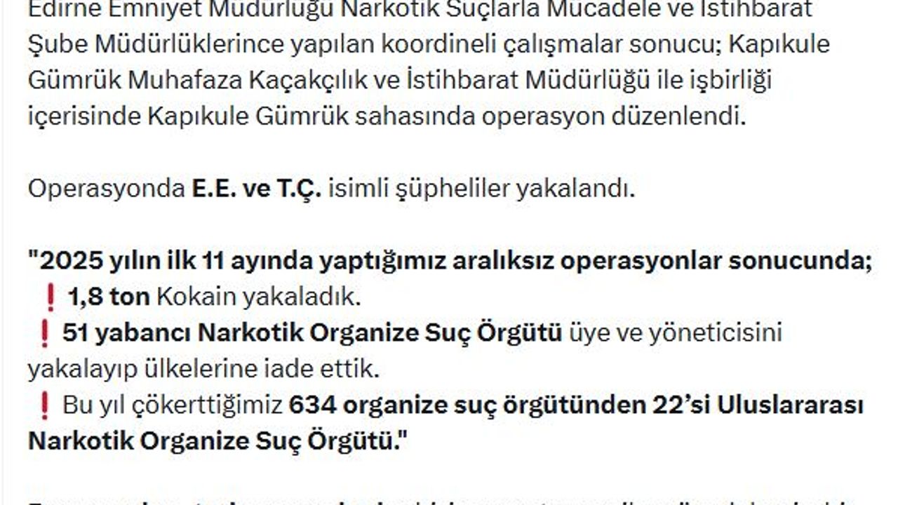 İçişleri Bakanı Ali Yerlikaya, Kapıkule Gümrük Muhafaza Kaçakçılık ve İstihbarat Müdürlüğü ile polis tarafından ortaklaşa düzenlenen operasyonu sosyal medya hesabından duyurdu. Buna göre; uluslararası uyuşturucu madde ticareti yapan şüphelilere yönelik operasyonda 31 kilogram kokain ele geçirildi. E.E. ve T.Ç. isimli 2 şüpheli yakalandı.