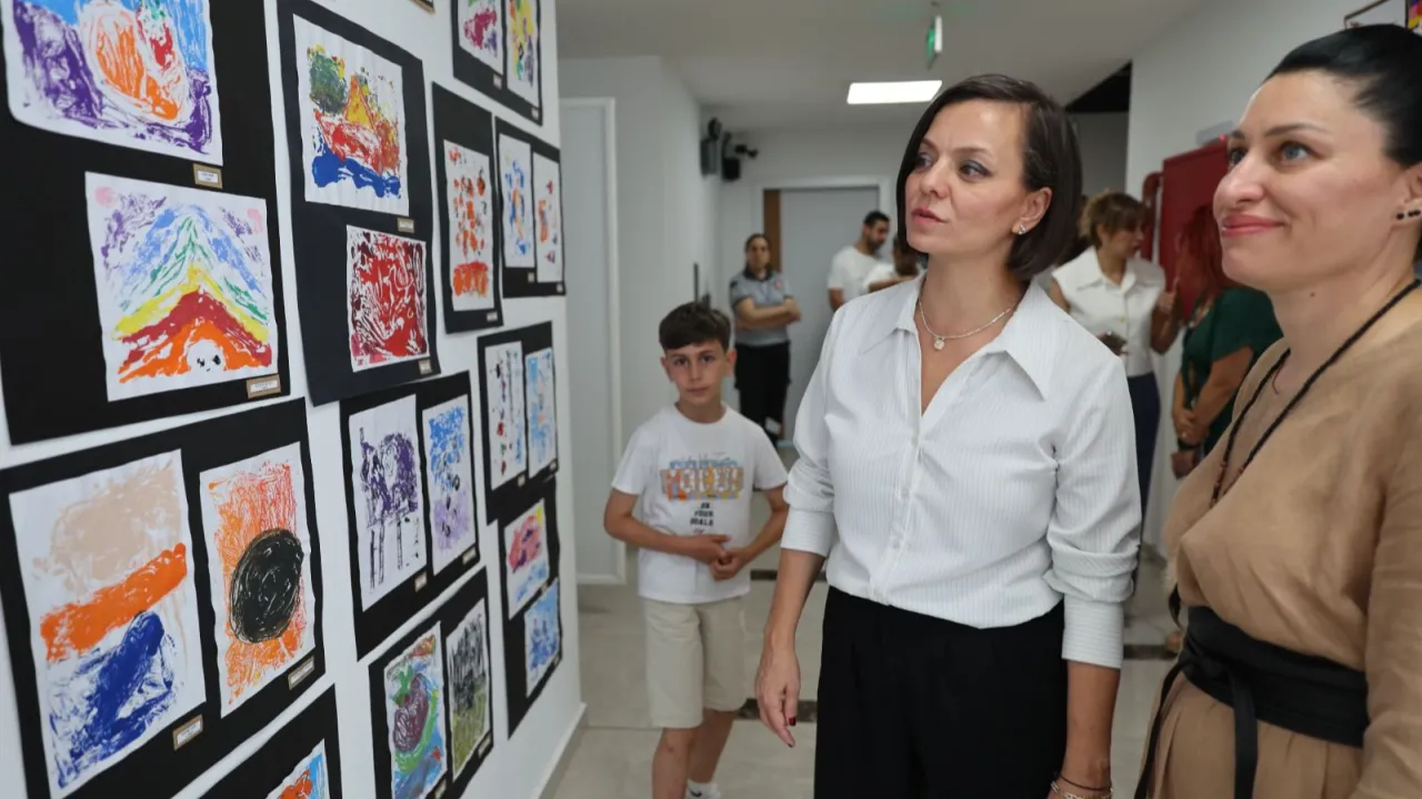 Konuşmasında sanat emekçilerine, katılımcılara ve özellikle sergiye katkı sunan eğitimcilere teşekkür eden Kınay, daha sonra çocuk resim kursu eğitmeni Oylum Gökçen Öterbülbül ve çini kursu eğitmeni Nesrin Dikmen’e doğa dostu fidan sertifikası verdi.