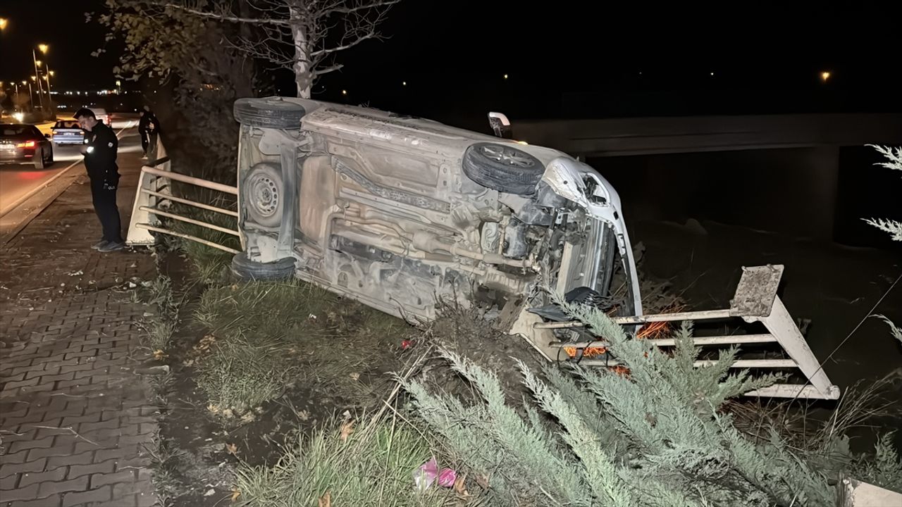 Çarpışmanın etkisiyle hafif ticari araç yol kenarına devrildi.