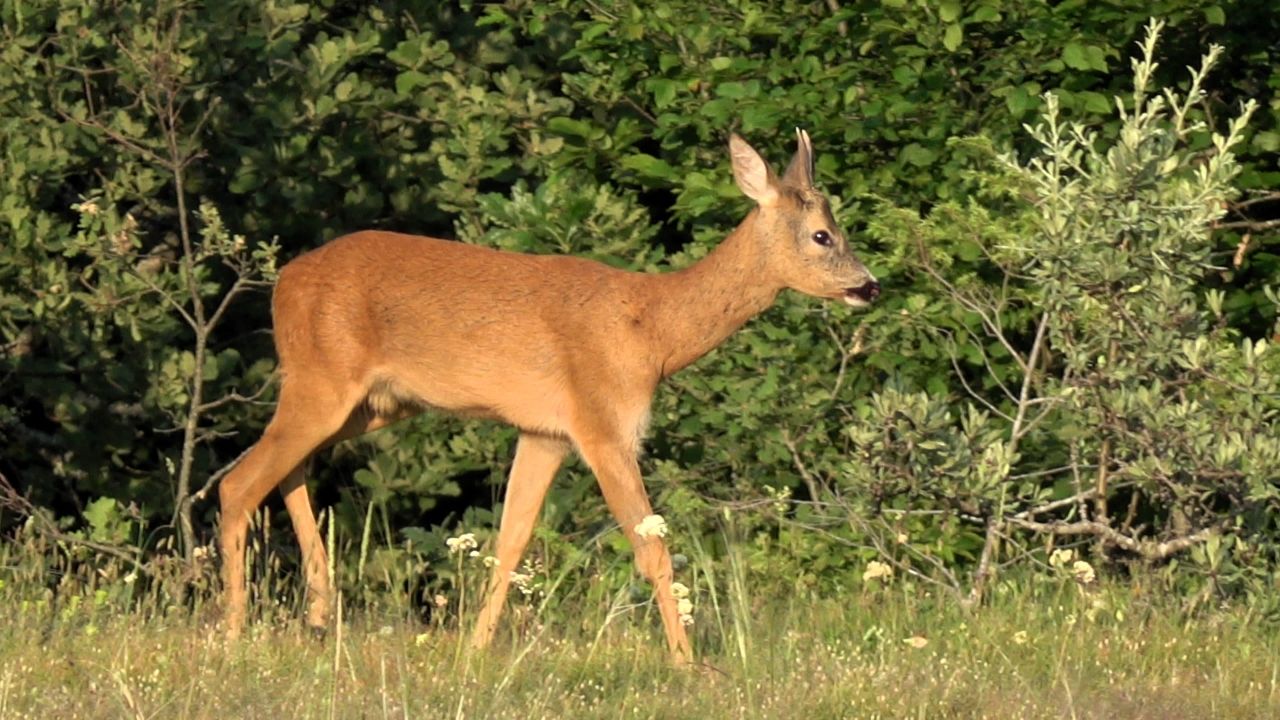 İlçedeki ormanlık alanın kenarında yürüyen karacayı fark eden bir kişi, o anları kamerayla kaydetti.