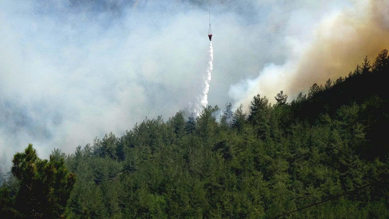 Yoğun dumanla kaplı bölgede, gündüz helikopter destekli yürütülen söndürme çalışmaları gece boyunca da karadan sürdürülüyor.