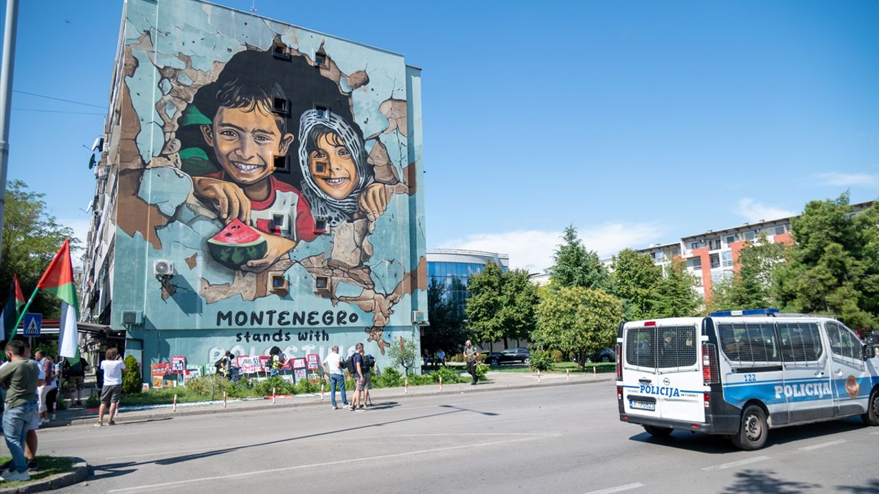 Golootocke Zrtve Meydanı'nda Filistinli iki çocuğun duvar resminin yapıldığı yerde toplanan Karadağlılar, İsrail'i protesto etti.